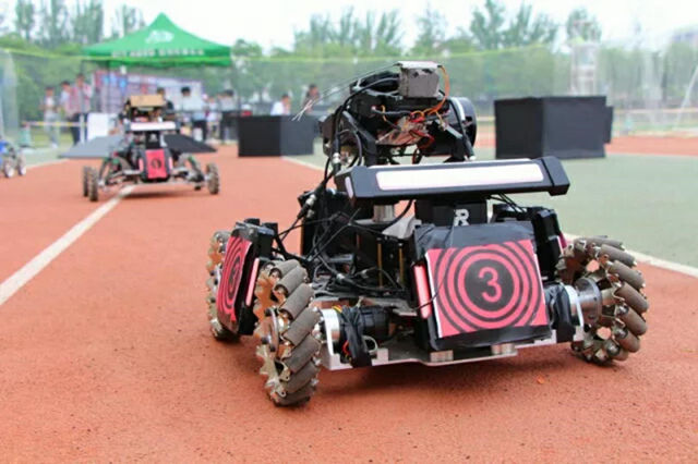 比賽采用紅、藍雙方對抗的形式,參賽隊伍通過自行設計制造多種機器人進行射擊對抗。參賽隊員需要遙控可以發射“彈丸”的手動機器人在復雜的場地中移動并發射“彈丸”,攻擊對方機器人和基地,擊毀敵方機器人方為獲勝。