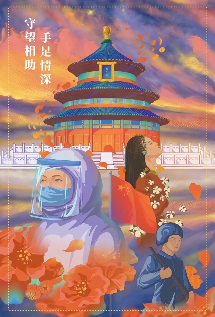 作品以絢麗的色彩為底色,以火紅的石榴花襯托軍、民、醫三種形象。身著防護服的醫務人員、著民族服飾的女性和持槍的衛士,由石榴花簇擁,眼神堅定,目視前方,背靠國旗,寓意我國各族人民團結一心,戰勝一切艱難險阻,走向絢麗輝煌的明天。