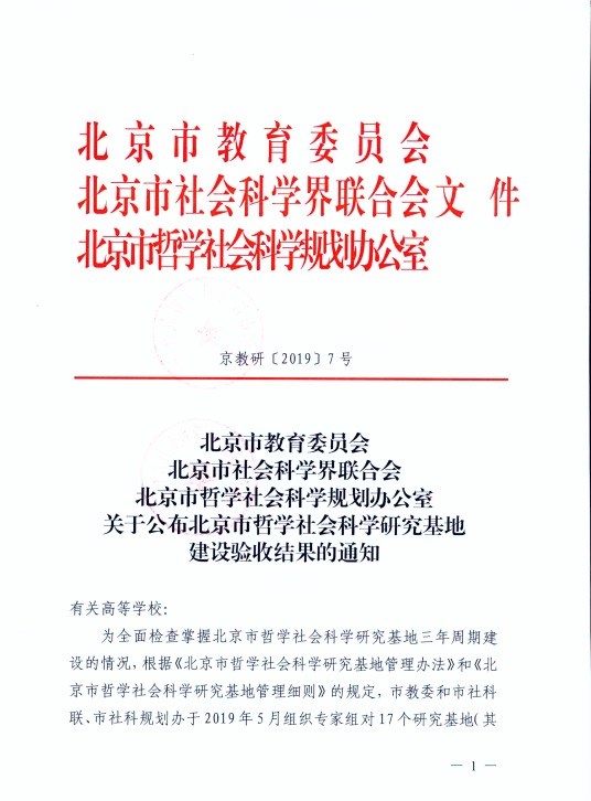 近日,北京市教育委員會(huì)、北京市社會(huì)科學(xué)界聯(lián)合會(huì)、北京市哲學(xué)社會(huì)科學(xué)規(guī)劃辦公室聯(lián)合發(fā)文,對(duì)2019年參與北京市哲學(xué)社會(huì)科學(xué)研究基地三年周期建設(shè)檢查的結(jié)果予以公布。我校北京經(jīng)濟(jì)社會(huì)可持續(xù)發(fā)展研究基地獲評(píng)“優(yōu)秀研究基地”。此次三年周期建設(shè)驗(yàn)收,全市共有17家研究基地參加,僅有4家獲評(píng)市級(jí)優(yōu)秀研究基地,另有2家研究基地檢查結(jié)果為不合格。