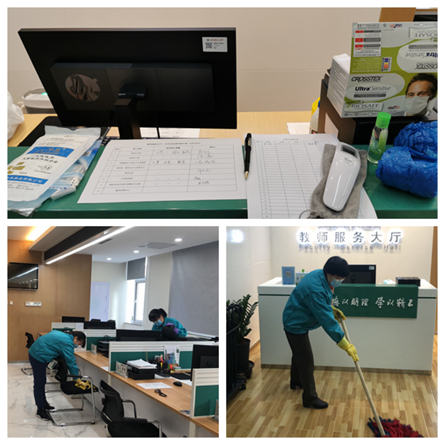 春節后,大廳恢復開放前一天,物業保潔人員進行了全面清潔和消毒工作,開放期間每天也將進行至少兩次消毒;為加強值班人員個人防護,中心每天向每位工作人員發放口罩、一次性手套、鞋套等防護物資,做好體溫檢測和登記;中心要求辦事教職工必須正確佩戴口罩,并做好體溫檢測、人員身份認證和登記工作。通過全方位防控,有力保障全體工作人員和辦事人員的健康和安全。