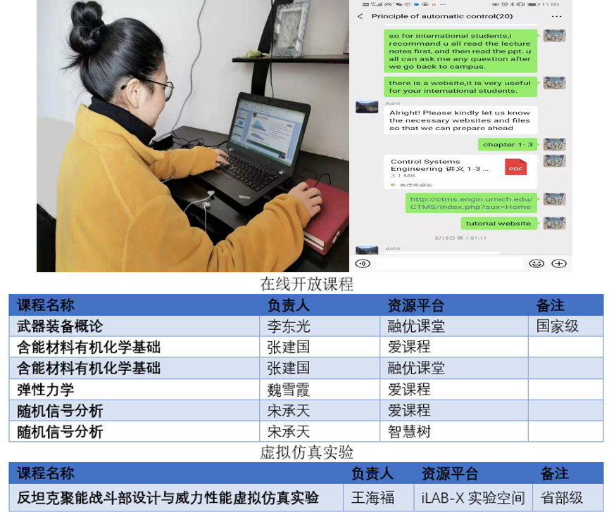 除利用“樂學”平臺提供線上教學外,學院教師更是積極研究新方法,探索新工具,想方設法提升線上教學質量,健全教學效果反饋機制。如王正杰教授的《機電控制技術(雙語)》課程在“樂學”平臺之外單獨建立了課程微信群,進行線上實時答疑,明顯提升了在線教學互動效果;龔鵬副教授的《數字通信技術》課程擬借助騰訊會議、釘釘等工具實現直播教學,將大大提升課堂教學體驗。同時,學院開設的《武器裝備概論》《反坦克聚能戰斗部設計與威力性能虛擬仿真實驗》等多門共享課程已在多個開放共享課程平臺上線,供全國大學生觀看學習。