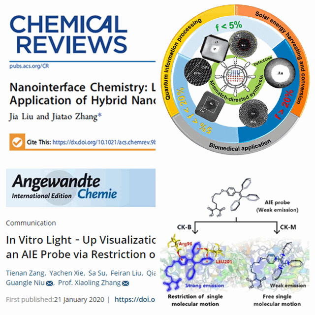 抗擊疫情期間,我院教師積極有序地開展科研工作,近日取得了可喜的成績。張加濤團隊在國際頂級期刊《Chemical Reviews》(影響因子54.3)上在線發表題為《Nanointerface Chemistry: Lattice-Mismatched-Directed Synthesis and Application of Hybrid Nanocrystals》的綜述論文。張小玲教授、張汝波副教授與合作者在國際頂級期刊《Angew. Chem. Int. Ed.》(影響因子12.1)上在線發表題為《In Vitro Light‐Up Visualization of a Subunit‐Specific Enzyme by an AIE Probe via Restriction of Single Molecular Motion》的論文。