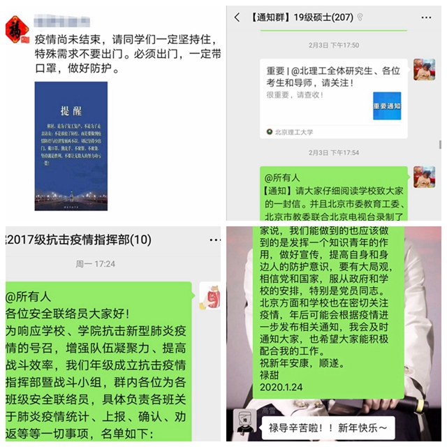 編輯:秦月 審核:王振華 張加濤 閱讀次數:疫情防控期間,北理工化學與化工學院按照學校黨委關于做好新型冠狀病毒感染的肺炎疫情防控工作的相關要求,第一時間成立了以學院黨委書記、院長為組長的疫情防控工作領導小組,全面落實黨中央及各級部門決策部署,完善本學院防控舉措。小組成員分工負責,強化責任擔當,及時在防控工作群傳達學校最新疫情防控要求,并按照學校要求在做好疫情防控工作的同時,扎實有效地推進了學院科研、教學、學生管理等各項工作。