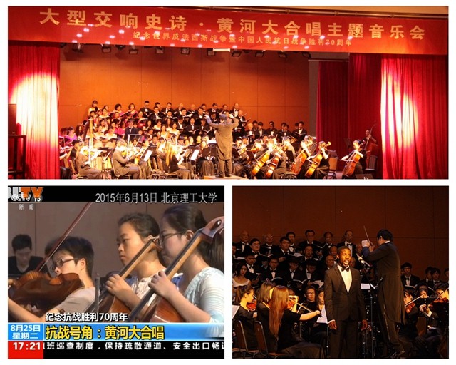 學校于6月13日晚在中關村校區文化劇場隆重舉行了交響史詩黃河大合唱——紀念中國人民抗日戰爭暨世界反法西斯勝利70周年主題音樂會。黨委副書記副校長項昌樂與數百名師生一起在音樂中緬懷先烈,共同紀念中國人民保家衛國、爭取和平的光輝歷史。中央電視臺《新聞直播間》欄目對本次音樂會進行了報道。音樂會中,我校交響樂團、學生合唱團演奏演唱了交響史詩《黃河大合唱》多個經典選段,還與教工合唱團一起演唱了《松花江上》等經典愛國歌曲。